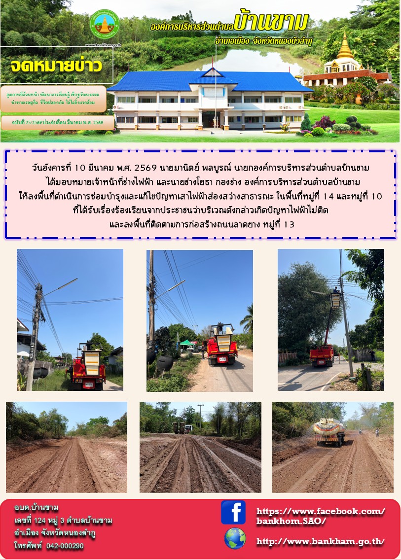 เจ้าหน้าที่ช่างไฟฟ้า ลงพื้นที่ดำเนินการซ่อมบำรุงและแก้ไขปัญหาเสาไฟฟ้าส่องสว่างสาธารณะ และลงพื้นที่ติดตามการก่อสร้างถนนลาดยาง หมู่ที่ 13